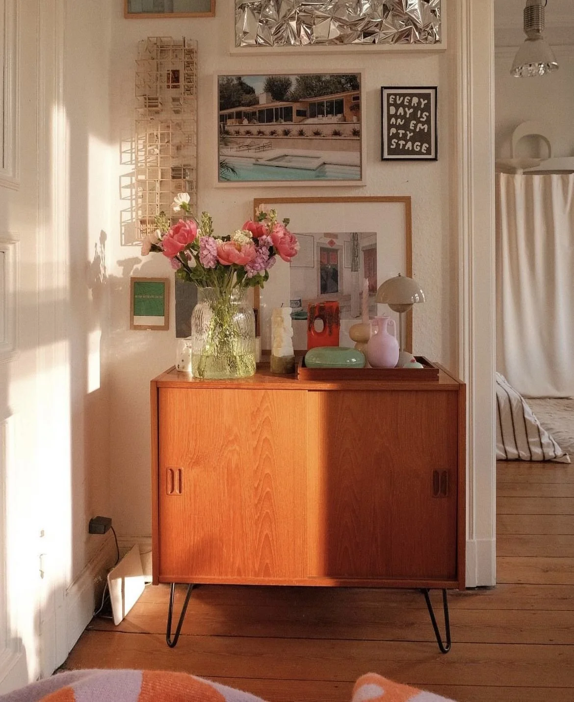 Good morning! I’m in the art room in my house — I took today & tomorrow off as a gift to myself for my birthday & I’ve never loved myself more. I am SO excited to have 2 days to myself to do things I want to do like process / get magical for my birthday (including pulling Tarot cards), paint the art room, knit, sew, & play Animal Crossing. Omg!!! I’m really, really happy about it. And right now I’m sitting at my desk & Garfield is sitting in my lap, the light is coming through the windows & reflecting off the mirror ball all over the room, & I’m listening to summer school radio.